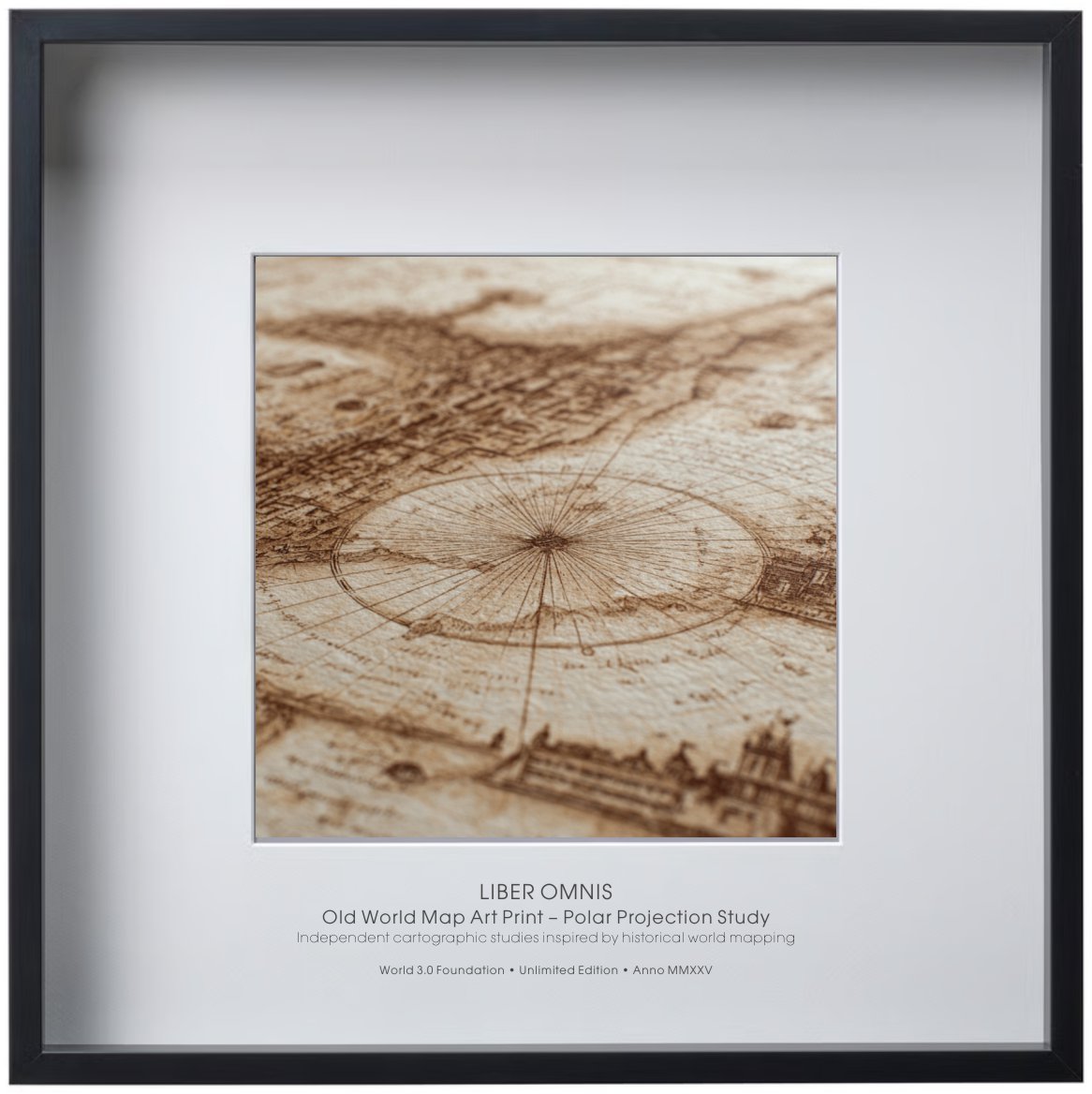 An old world map art print inspired by polar projection techniques used in early exploration. The radial layout draws attention to measurement, orientation, and the limits of perception. Executed in a restrained ink style, the work recalls archival scientific plates. Suitable for collectors drawn to history, structure, and form.